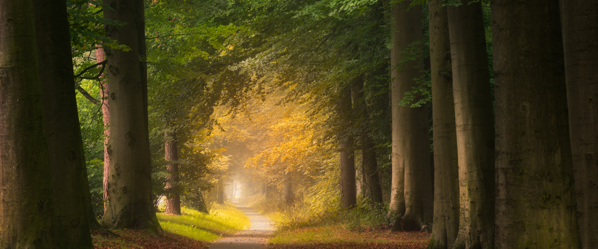 Ein Weg inmitten eines Waldes mit großen, grünen Laubbäumen
